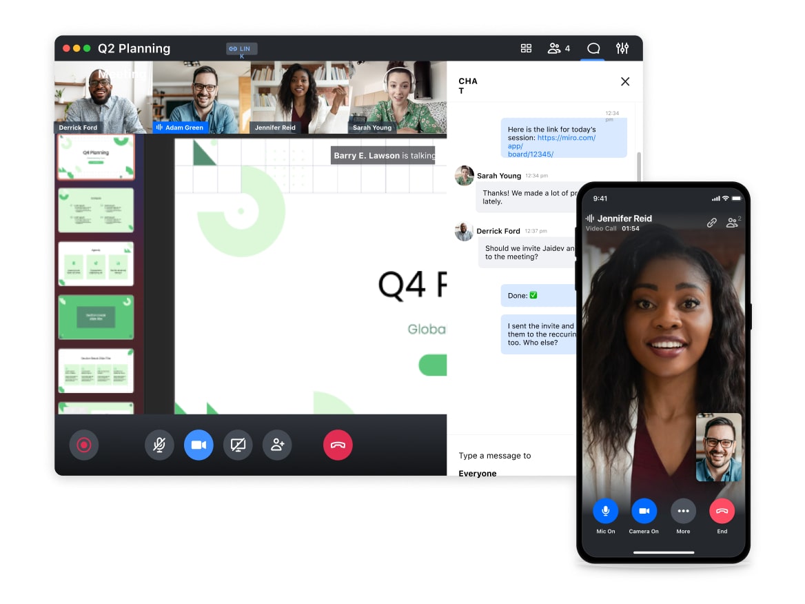 Torne o trabalho em equipe entre escritórios e funcionários remotos envolvente e eficiente. Reúnam-se de qualquer dispositivo para videoconferências seguras com toda a equipe.